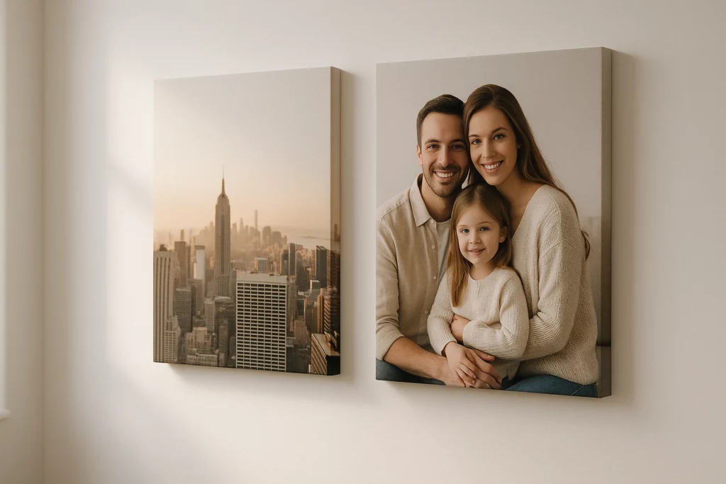 Vous pouvez également choisir entre un châssis de 2 ou 4 cm d’épaisseur, et le bord de la toile peut aussi être imprimé. Les toiles sont disponibles en finition mat.